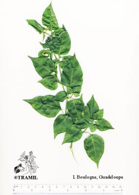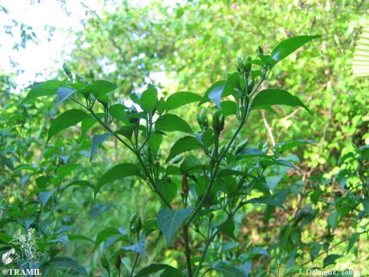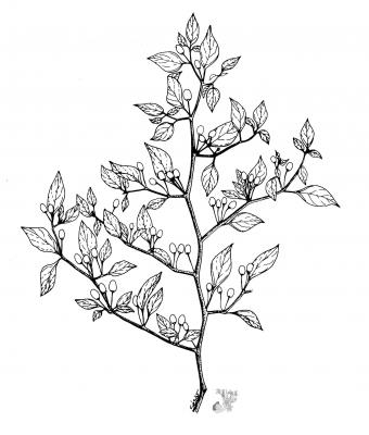 Hierba o arbusto densamente ramificado. Hojas con pecíolo delgado, solitarias o en pares, ovadas u ovado-lanceoladas, ápice acuminado. Dos flores o más en cada nudo, rara vez una; cáliz truncado o con lóbulos diminutos; corola blanco-verdosa o blanco amarillenta. Fruto rojo, de 1.5 a 3 cm de diámetro, elipsoide-lanceolado o lanceolado, con ápice agudo. Semillas cremosas a amarillentas.