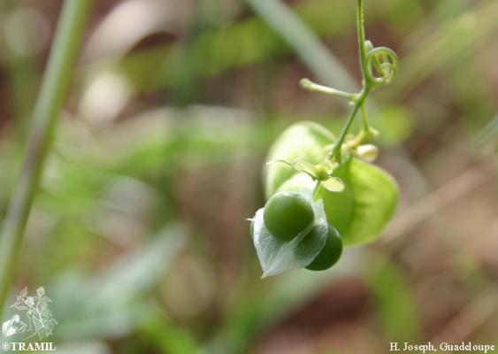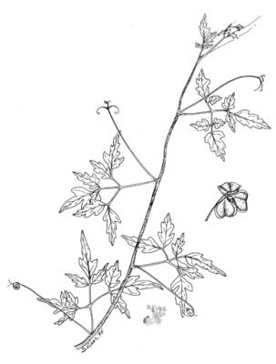 Trepadora herbácea con tallo de 5 a 6 m acostillado. Hojas biternadas, folíolos aovados o lanceolados, agudos o acuminados, dentados o lobulados. Inflorescencia umbeliforme con largos pedúnculos y flores blancas de 4 a 5 mm. Cápsula subglobosa de 3 a 4 cm; semillas negras de 4 a 5 mm.