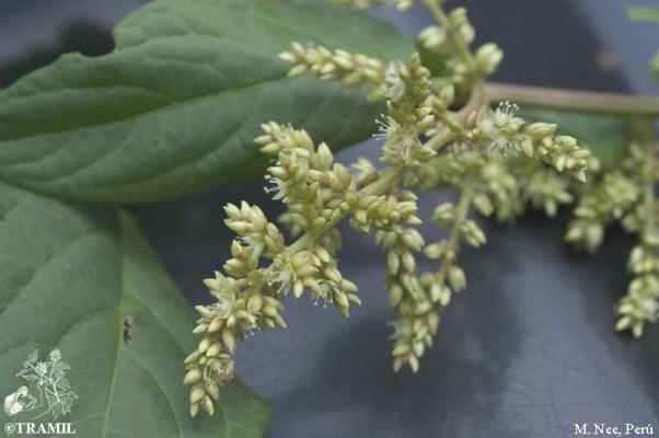 Trepadora leñosa. Hojas aovadas a lanceoladas, acuminadas o agudas, de 6 a 18 cm. Inflorescencias axilares o terminales de hasta 20 cm; flores de 3 a 4 mm; sépalos blancos o verdosos, ovales a oblongos. Utrículo globoso a ovoideo de 4 a 5 mm de longitud; semilla lenticular o reniforme de color negro.
