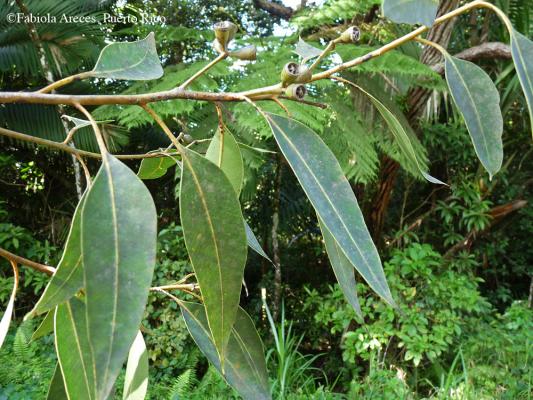 Eucalyptus spp. son árboles de hasta 40 m de altura. Tallo erecto, corteza lisa, escamosa. Hojas simples, alternas y aromáticas.