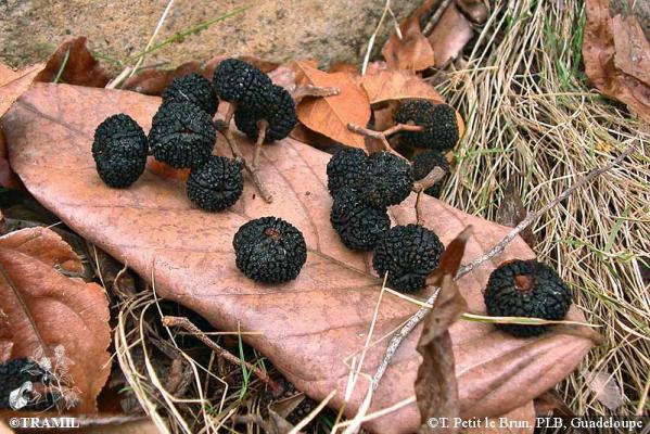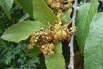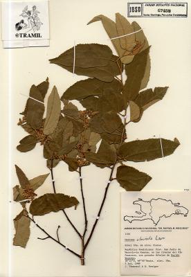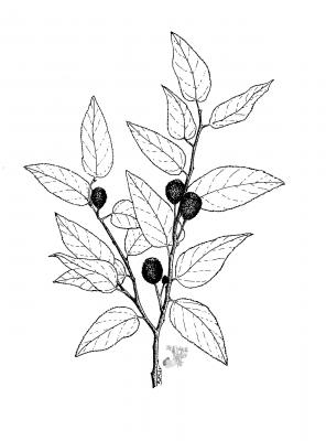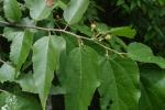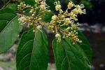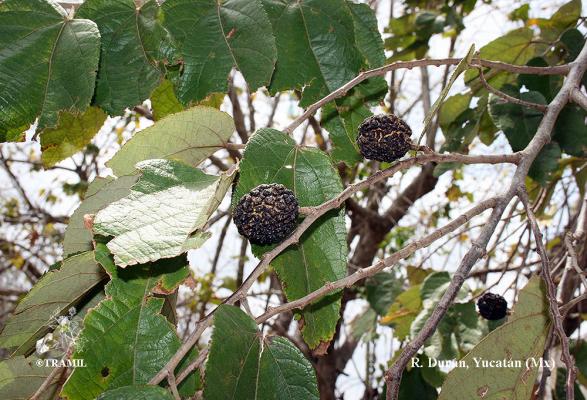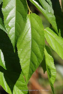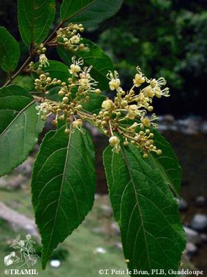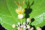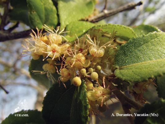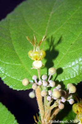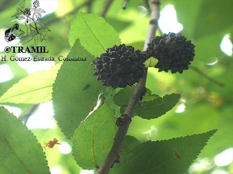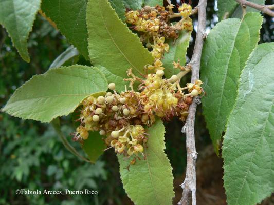 Arbusto o árbol de hasta 20 m. Hojas oblongas a anchamente aovadas, de 3 a 15 cm, agudas a acuminadas, aserradas, estrellado-tomentosas, marcadamente asimétricas. Flores amarillentas, fragantes, en cimas axilares pequeñas, con 5 pétalos de 3 mm. Fruto leñoso, globoso u oval, de 2 a 4 cm, con tubérculos duros.