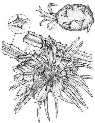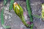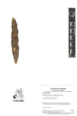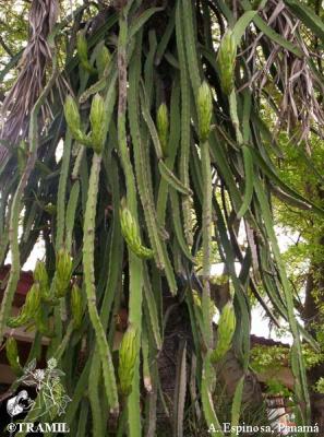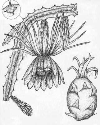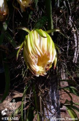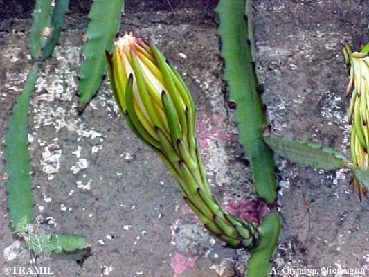 Planta trepadora arbustiva, frecuentemente epífita, con tallos verdes, alargados comúnmente triangulares, trialados y articulados de 5 a 6 cm de diámetro, con areolas marginales enteras a ligeramente anguladas a onduladas, armadas con espinas cortas y firmes. Flores en forma de trompeta, de color blanco cremoso de 10 a 15 cm de largo; con numerosas brácteas foliáceas persistentes de 1 a 2 cm de largo. Fruto, una baya grande purpúrea oblonga a ovoidea de aproximadamente 10 cm de largo; pulpa comestible. Semillas numerosas pequeñas y negras.