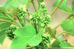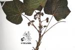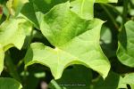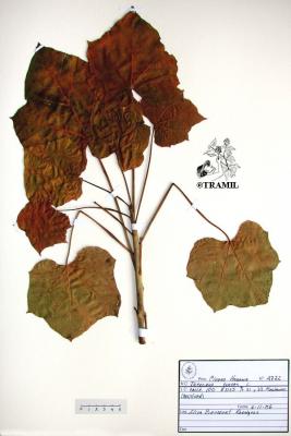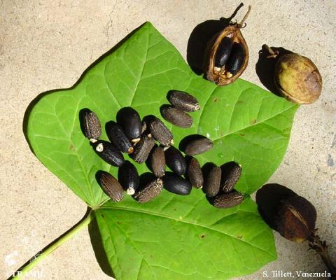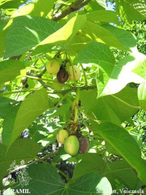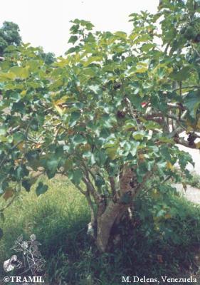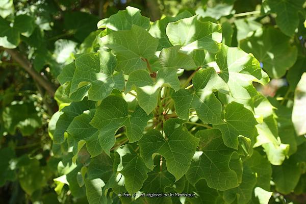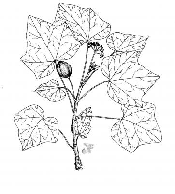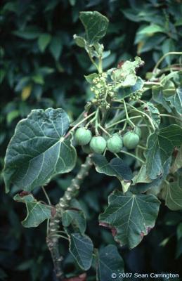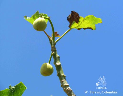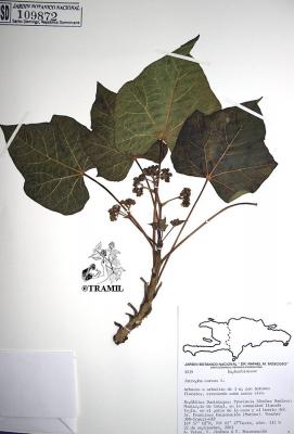 Arbusto o arbolito de hasta 5 m, con látex amarillo lechoso o rojizo. Hojas redondeado-aovadas, 3-5 lobadas, cordadas en la base, agudas o acuminadas en el ápice. Cimas pequeñas, densas, largo-pedunculadas; pétalos blanquecinos oblongo-ovados, densamente pilosos. Cápsula elipsoide, de 2.5 a 4 cm; semillas de 2 cm, negruzcas.