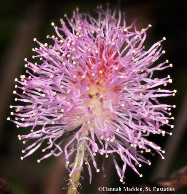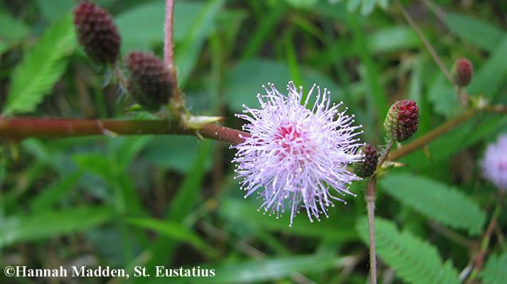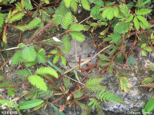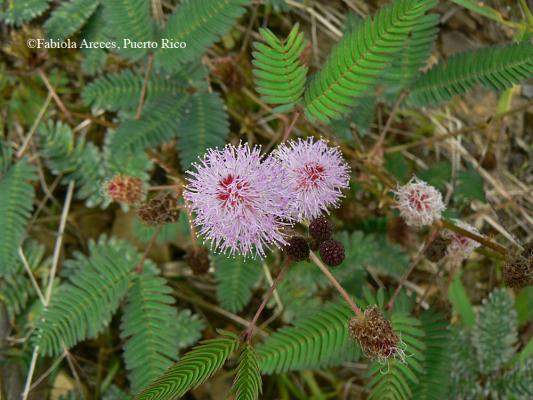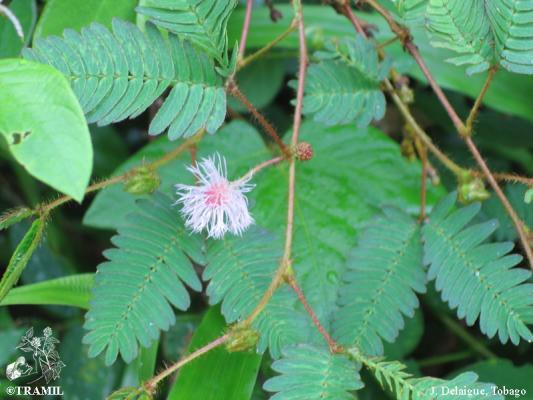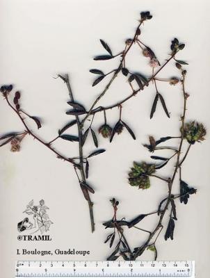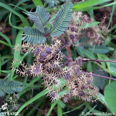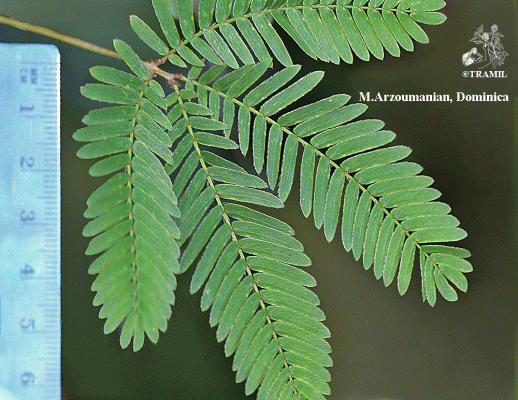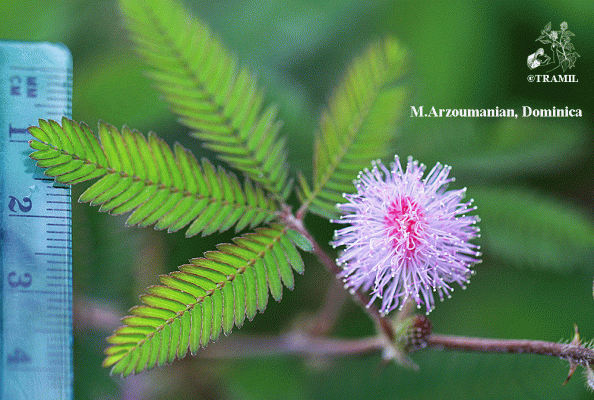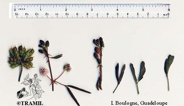 Planta anual o sub-arbusto, pilosa, con espinas recurvadas en los tallos. Hojas con 1 a 2 pares de pinnas, folíolos de 15 a 25 pares, oblongos o linear oblongos de 5 a 10 mm, obtusos o agudos. Flores rosadas en cabezuelas globosas, pedunculadas. Legumbre linear oblonga, segmentada, de 1 a 1.5 cm, con cerdas en los márgenes.
