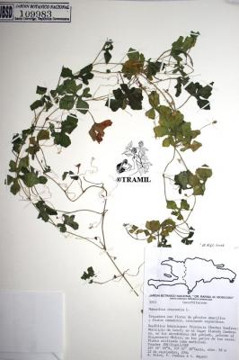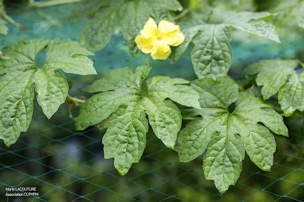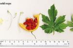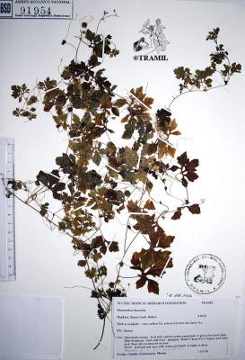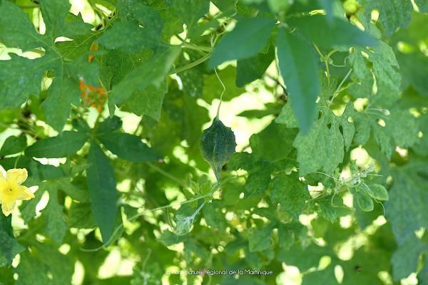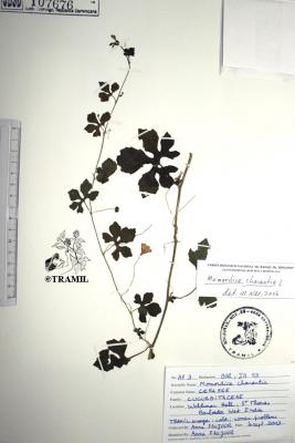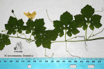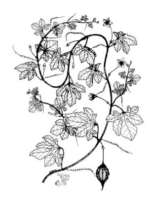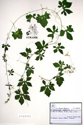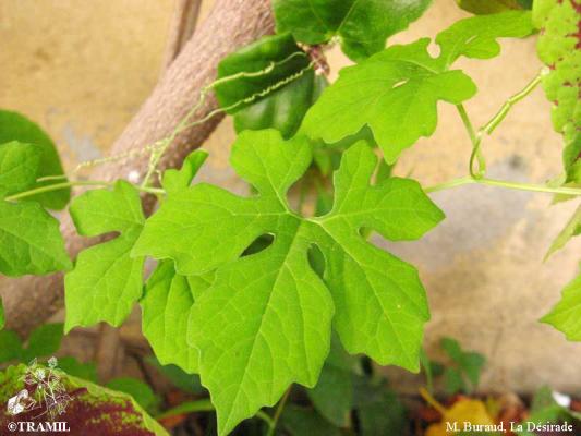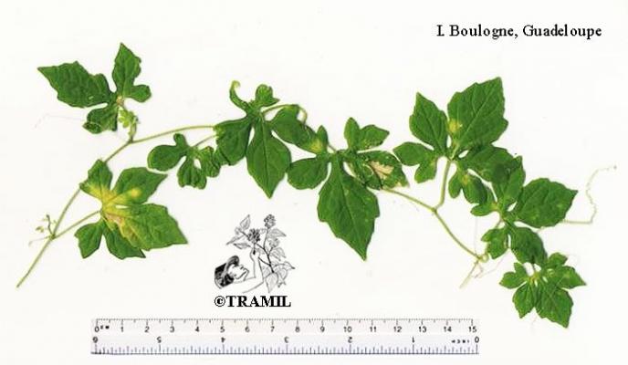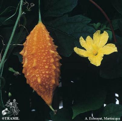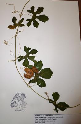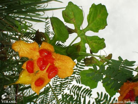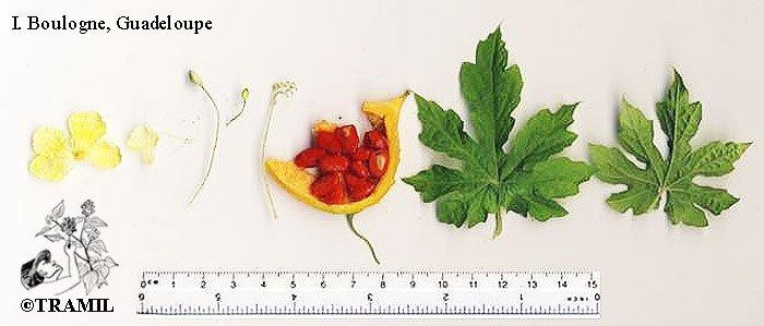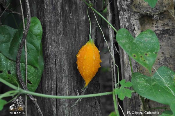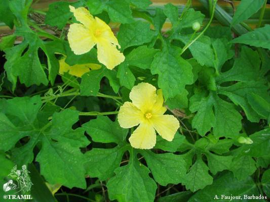 Hierba trepadora de hasta 6 m, usualmente muy ramificada. Hojas alternas de 4 a 12 cm, 5-7 lobadas; lóbulos obtusos o mucronulados con márgenes dentados o crenados. Corola amarilla, segmentos obtusos o emarginados de 1.5 a 2 cm. Fruto elipsoide, tuberculado, dehiscente, de 5 a 15 cm de diámetro, de amarillo a anaranjado, con 3 valvas; pulpa de color rojo; semillas elípticas, planas, de 10 a 16 mm.