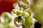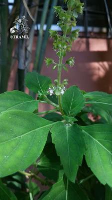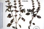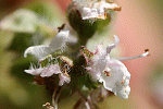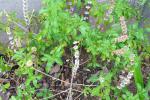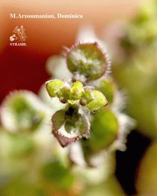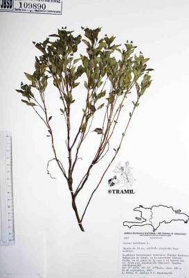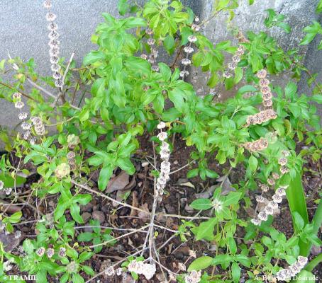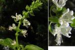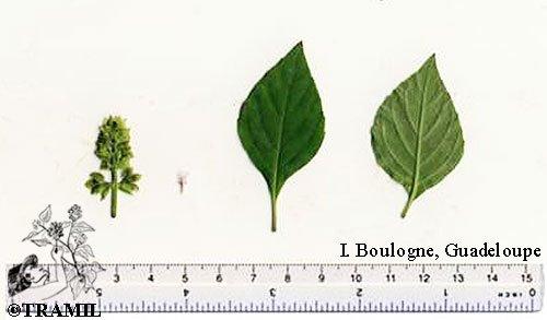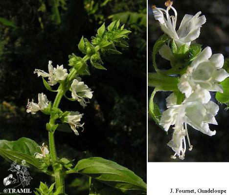 Herbácea anual, erecta, de hasta 60 cm; las partes nuevas pubescentes. Hojas elípticas, ovadas u oblongas de 2 a 4 cm, agudas en el ápice, atenuadas en la base, dentadas o enteras, glabras. Inflorescencia verticilada de hasta 20 cm; pedicelos muy cortos, recurvados; cáliz largo-ciliado de 5 mm; corola blanca, de 4 a 5 mm; filamentos superiores con un apéndice dentiforme en la base.