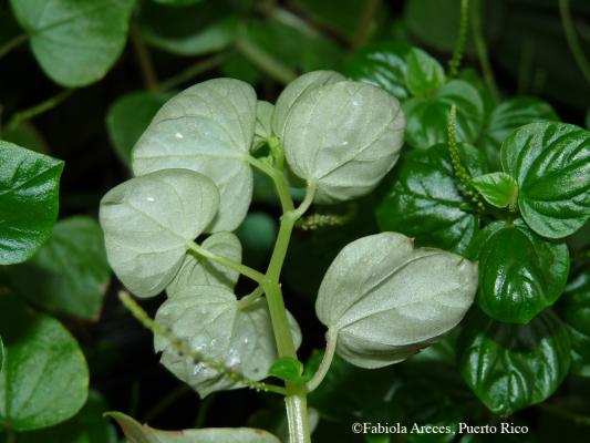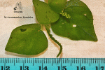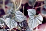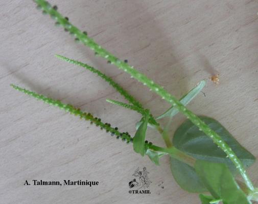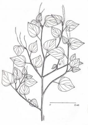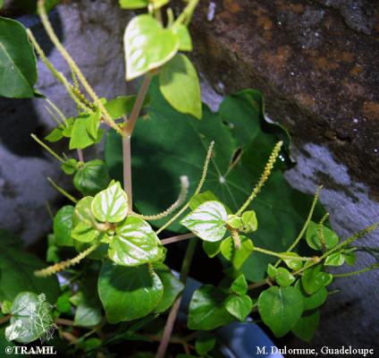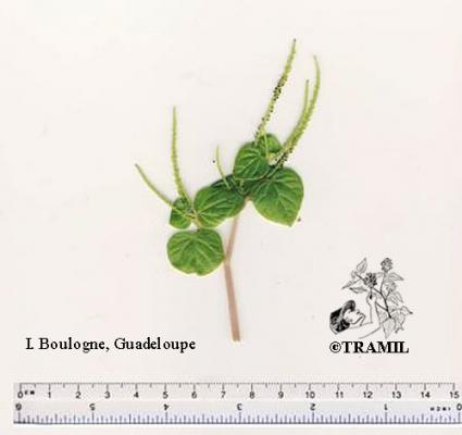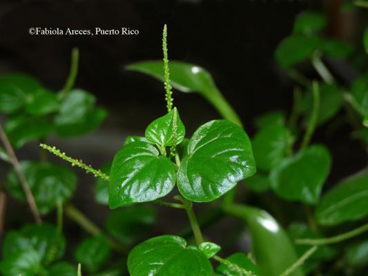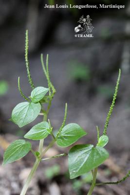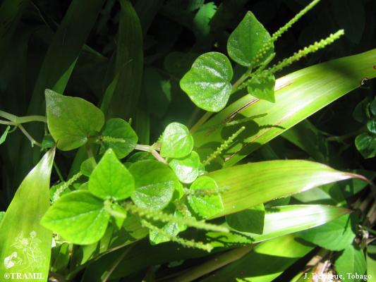 Planta herbácea erecta o ascendente, de hasta 35 cm, de tallo suculento. Hojas alternas, delgadas, ovadas, de 15 a 25 mm, agudas u obtusas, ligeramente cordadas o redondeadas en la base; con 5 nervios principales. Espigas terminales simples, axilares u opuestas a las hojas, de 2 a 5 cm; brácteas redondeado-peltadas; flores diminutas, esparcidas. Fruto, bayas subglobosas o elipsoides, de 0.5 a 0.6 mm de diámetro.