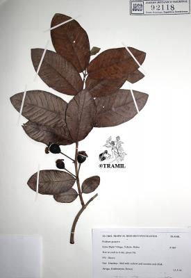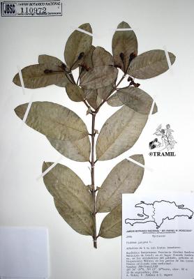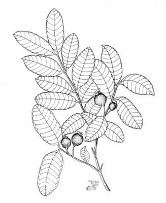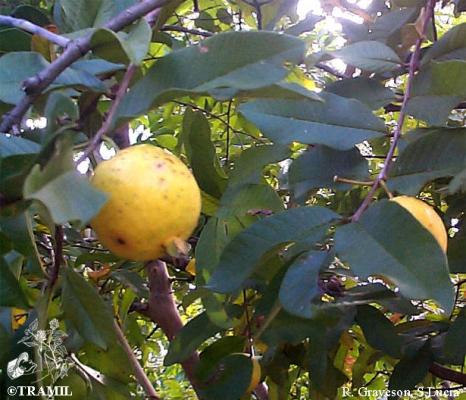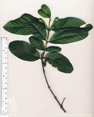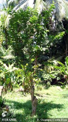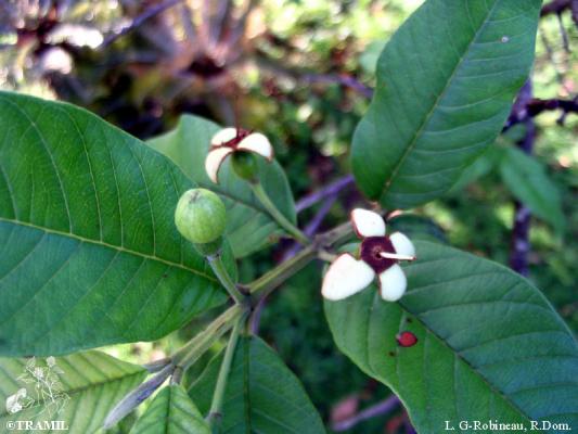 Árbol o arbusto de hasta 10 m de alto, de corteza escamosa. Hojas opuestas, corto-pecioladas, elípticas a oblongas, subcoriáceas, nervaduras conspicuamente impresas en el haz, prominentes en el envés. Flores blancas solitarias o en grupos de 2 a 3, en pedúnculos delgados; estambres numerosos. Fruto comestible, globoso o piriforme, amarillo, de 3 a 6 cm de diámetro.