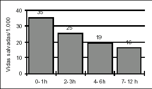 | Figura 2. Efecto del tratamiento trombolítico sobre la mortalidad según el tiempo transcurrido desde el comienzo de los síntomas. El mayor beneficio corresponde a los pacientes que son tratados más precozmente en el curso del IAM. Tomado de Fibrinolytic Therapy TrialistsÂ’ (FTT) Collaborative Group. Indications for fibrinolytic therapy in suspected acute myocardial infarction: collaborative overview of early mortality and major morbidity results from all randomised trials of more than 1000 patients. Lancet 1994; 343:311-322. |