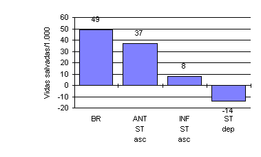 | Figura 3. Efecto del tratamiento trombolítico sobre la mortalidad según las alteraciones del ECG al ingreso. Los pacientes con bloqueo de rama o ST elevado en cara anterior son los que más se benefician del tratamiento fibrinólítico. Tomado de Fibrinolytic Therapy TrialistsÂ’ (FTT) Collaborative Group. Indications for fibrinolytic therapy in suspected acute myocardial infarction: collaborative overview of early mortality and major morbidity results from all randomised trials of more than 1000 patients. Lancet 1994; 343:311-322. |