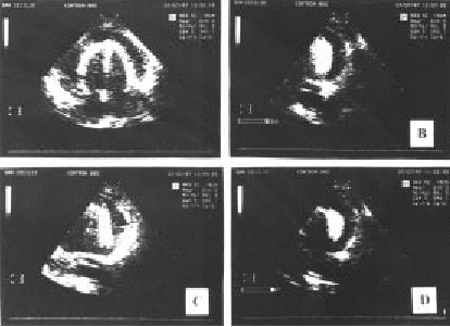 | Figura 6.—Pericardiocentesis percutánea subxifoidea con control ecocardiográfico. Punción pericárdica para colocación de un catéter de drenaje (técnica de Seldinger modificada) guiada mediante ecocardiografía 2-D en un caso de taponamiento cardiaco. A: Imagen 4 cámaras con derrame pericárdico importante. B: Imagen mostrando la entrada en saco pericárdico de la aguja de punción. C: Imagen mostrando la introducción de la guía metálica a través de la aguja metálica. D: Imagen mostrando el introductor correctamente situado dentro del saco pericárdico. Una vez confirmada la situación del introductor dentro del saco pericárdico se pasará el catéter de drenaje. |