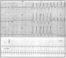 Taquicardia con QRS ancho. Se trata de un fluter auricular que conduce por una vía accesoria y simula una TV