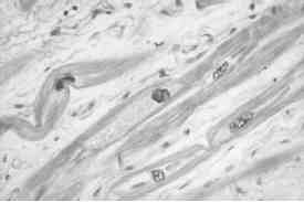 Corte longitudinal de las fibras musculares del nodo AV. El núcleo es grande y ovalado con un prominente halo perinuclear. Las miofibrillas son escasas y las estriaciones poco llamativas.