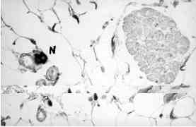 Confirmación de las fibras nerviosas (N), mediante la técnica inmunohistoquímica con anticuerpos contra la proteína S-100