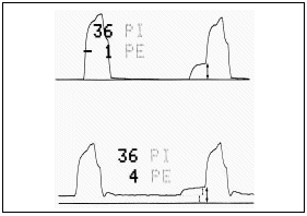 | Figura 2. Registros de presión en la vía aérea en los que se muestra cómo la utilización de 4-5 cm H2O de PEEP no aumenta ninguna de las presiones (p. pico, p. meseta y auto-PEEP). En estas circunstancias está indicado utilizar la PEEP durante la ventilación asistida para facilitar la sincronía paciente-respirador (ver Figura 3) |
