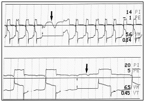 | Figura 3. Trazados de presión y flujo en la vía aérea en presión de soporte. La utilización de PEEP no incrementó la cifra de auto-PEEP (flecha gruesa de la figura), y sí facilitó la utilización de este modo de ventilación, aumentando el volumen corriente de 140 mL a 450 mL sin necesidad de aumentar la presión de ayuda. |