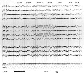 Trazado electroencefalográfico de un paciente en coma, a baja velocidad mostrando u patrón con dos fases de actividad bien diferenciadas.