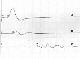 | Figura 16.- Tres trazados de Potencial muscular. En A: Potencial normal. En B: Potencial propio de una axonopatía (neuropatía del paciente crítico), la disminución del tamaño del potencial es lo mas llamativo. En C: Potencial propio de una mielinopatía (polirradiculoneuritis), el retraso (L1-L2) del potencial y su aspecto multiforme (desincronizado) es lo mas llamativo. |