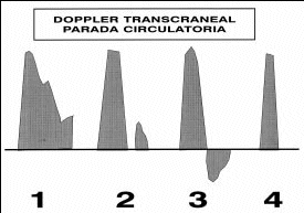 | Figura 25.- Dibujo que representa la evolución del registro de Doppler en su evolución hacia la muerte cerebral. El registro señalado con el número 1 presenta una onda normal. El registro número 2 representa el patrón de separación diástole-sístole, el número 3 el patrón denominado de Flujo Reverberante, y el 4 el patrón de Espigas sistólicas aisladas. Estos tres últimos patrones son compatibles con el diagnóstico de parada circulatoria cerebral. |