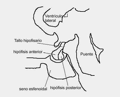 | Figura 3. Relación entre la hipófisis y estructuras anatómicas vecinas. La hipófisis asienta dentro de la silla turca del hueso esfenoidal. Las paredes laterales de la silla terminan en el seno cavernoso que contiene pares craneales III, IV, V y VI. Los tumores hipofisarios pueden producir defectos del campo visual, invasión de los senos esfenoidal y cavernoso y parálisis de los pares craneales. |