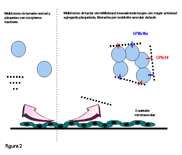 3.3. DAÑO ENDOTELIAL Y ALTERACIONES EN LA AGREGACIÓN PLAQUETARIA. El daño endotelial parece evidente, como lo demuestra la elevada concentración plasmática de proteínas liberadas desde las células endoteliales,(trombomodulina, factor von Willebrand y activador tisular del plasminógeno) durante el episodio agudo, con normalización durante la remisión20. También es posible detectar células endoteliales circulantes cuya concentración se correlaciona con el curso clínico de la enfermedad 21. Moake 22 propone como mecanismo patogénico la presencia en plasma de factores agregantes de las plaquetas, que estarían constituidos por multímeros de Factor von Willebrand (FvW) de peso molecular inusualmente alto, los cuales pueden ser liberados a la circulación desde células endoteliales dañadas o estimuladas por autoanticuerpos, complejos inmunes o toxinas. En condiciones normales, la célula endotelial sintetiza monómeros de FvW que se unen dando lugar a multímeros de elevado peso molecular. Estos multímeros son almacenados y posteriormente liberados desde la célula endotelial a la circulación. En el plasma son despolimerizados y convertidos en multímeros de menor tamaño por una proteína que podría estar ausente en los pacientes con PTT 23. Estos multímeros de FvW de peso molecular inusualmente alto poseen una mayor capacidad de agregación y adhesión plaquetaria (Figura 1) 22, 23. Se encontraron en pacientes portadores de PTT crónica en remisión y se piensa que no pueden detectarse durante la fase aguda de la enfermedad debido a su consumo en la agregación plaquetaria22, 23, 24(Figura 2). Estos hallazgos sustentan la base fisiopatológica del tratamiento con infusión de plasma (el cual proporcionaría la actividad despolimerizante de las moléculas inusualmente grandes de FvW) y un soporte teórico para el uso de plasma sobrenadante de crioprecipitados (el cual está deplecionado de FvW). |