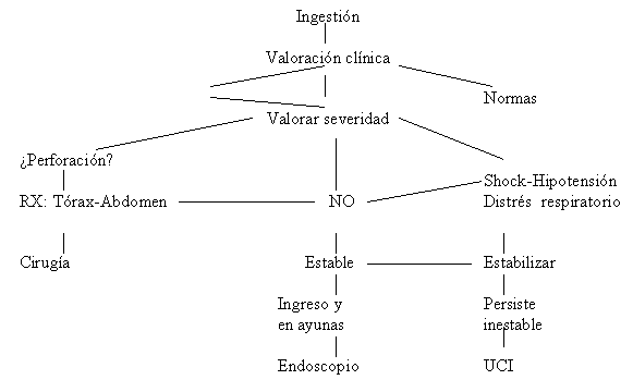 La endoscopia precoz evita demoras en el tratamiento y obvia éste en los pacientes sin lesiones (24, 25). De igual modo, la endoscopia es recomendada para establecer o confirmar un pronóstico o para identificar complicaciones respiratorias agudas tras una ingesta sintomática de lejía en niños con síntomas respiratorios y en los raros casos de ingesta con detergentes para lavadoras automáticas que causen sintomas (26). Dicha actitud permite un diagnóstico exacto de forma precoz. En pacientes causticados con lejía comercial sin sintomatología