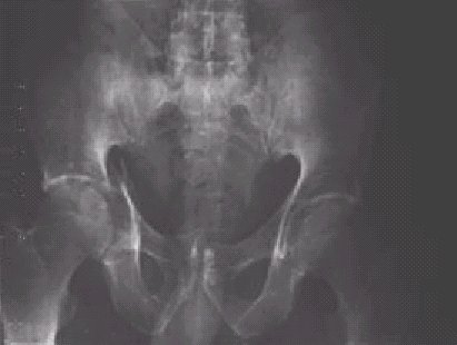 Figura 4.—Fractura unilateral derecha de pelvis y del muro anterior del cotilo derecho, proyección AP simple de pelvis.