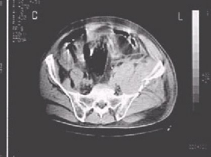 Imágenes de tomografía computerizada en un paciente con hematoma retroperitoneal en relación con fragmentos óseos de una fractura de pelvis.