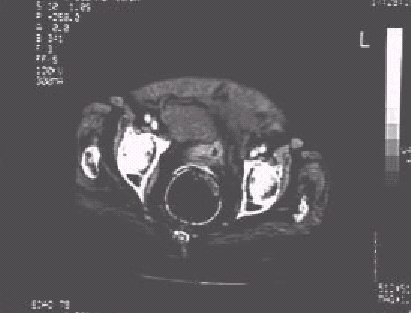 .—Tomografía Computerizada en una mujer politraumatizada con traumatismo pélvico. La imagen muestra un gran hematoma en región prevesical.