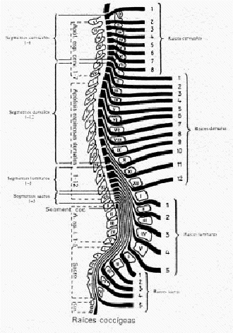 Figura 1.—Salida de las raíces del canal raquídeo y relación entre el nivel medular y el vertebral.