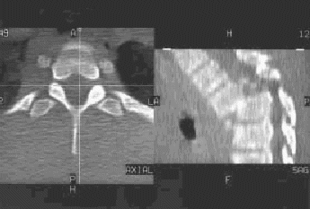 Figura 12.—TC de columna dorsal con reconstrucción sagital (mismo caso de las figuras 10 y 11): Luxación D4-D5 con anterolistesis completa de D4 sobre D5. En el plano axial (en un corte más bajo que el de la figura 11) pueden verse ambos cuerpos vertebrales superpuestos. En el plano sagital se observa la gran angulación de la columna y el grave compromiso del canal medular.