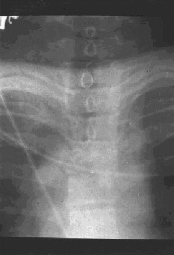 Radiografía anteroposterior de tórax (portátil) realizada en la sala de críticos: Rarefacción de la mitad derecha del cuerpo vertebral. La línea de las apófisis espinosas se pierde no se visualiza a nivel de D4.
