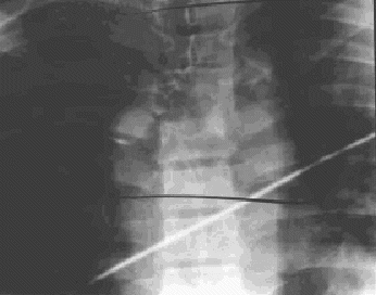 Radiografía anteroposterior de columna dorsal: No se visualiza el pedículo derecho ni la apófisis espinosa de D4. Desalineación en el plano transversal de las líneas laterales de los cuerpos vertebrales.