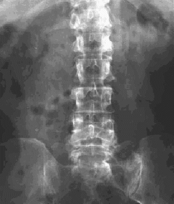 Radiografía anteroposterior de columna lumbar: Fracturas de todas las apófisis transversas derechas y 3.ª-4-ª izquierdas. Anomalías congénitas: hipoplasia bilateral de las 12.ª costillas y sacralización de L5.