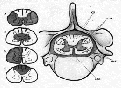 Síndromes medulares incompletos: A = Anterior, B = Central, C= Sequard, D = Posterior. HCEL = Haz corticoespinal lateral, HETL = Haz lateral, CP = Cordones posteriores.