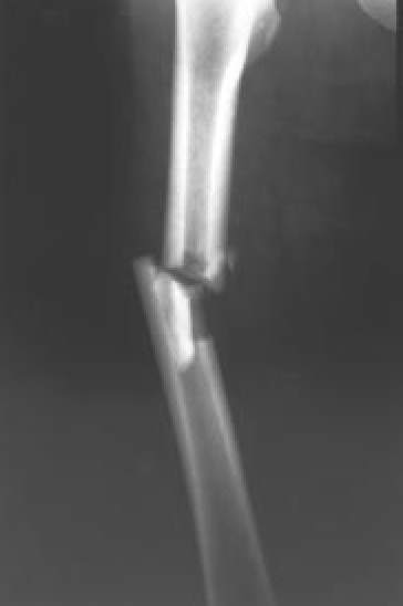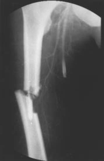 | Fig. 7A.: Fractura abierta de fémur, que clínicamente presentaba ausencia de pulsos distales a la lesión |