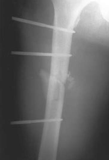 | Fig. 7C.: Control de reducción postoperatoria, tras osteosíntesis con fijador externo AO y reparación vascular |
