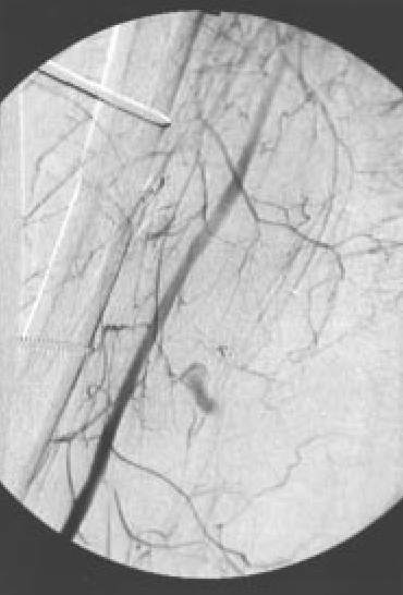 | Fig. 7B.: Imagen obtenida en arteriografía, mostrando "stop" a nivel de arteria femoral |